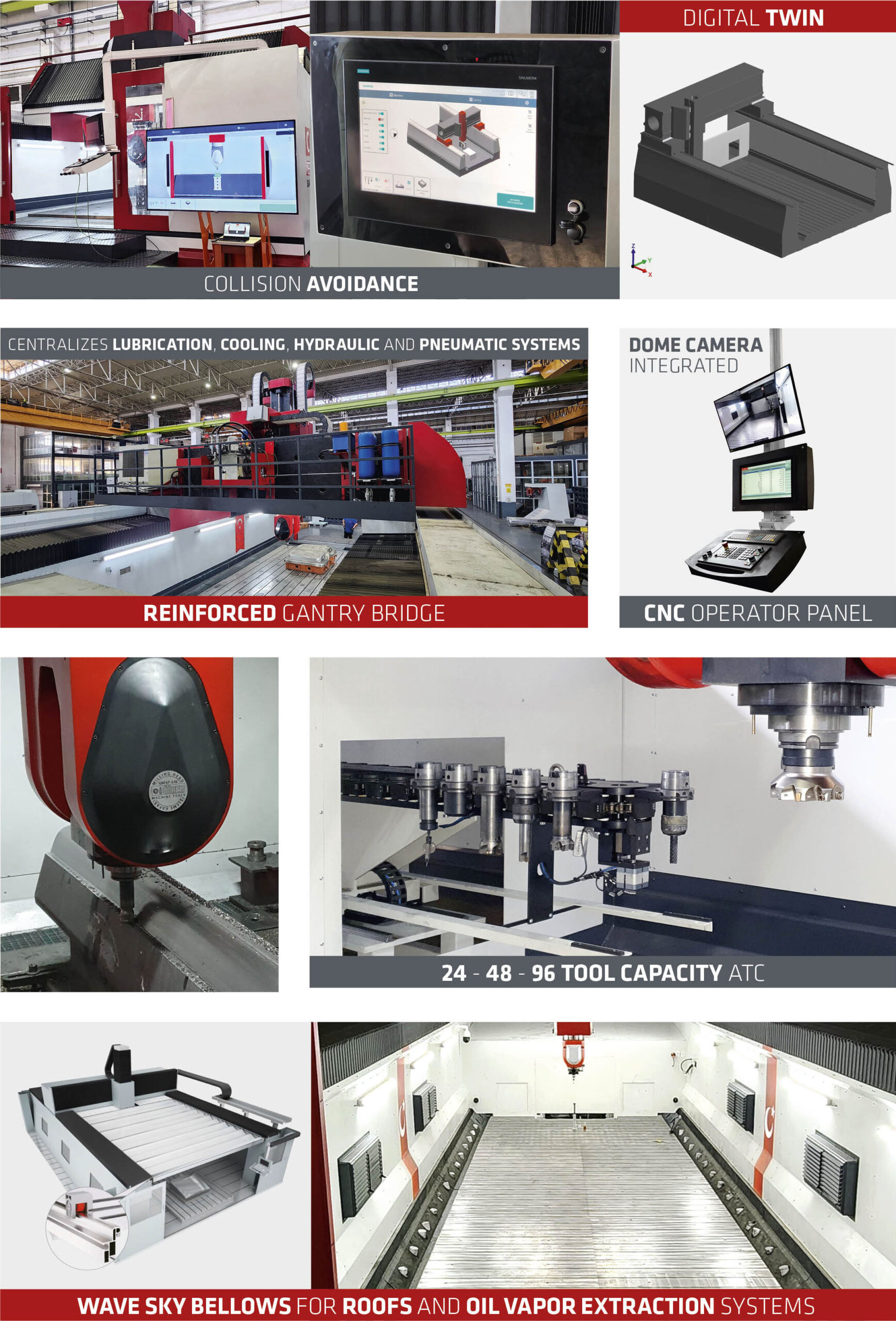 A TRUE PRODUCTION POWERHOUSE ENGINEERED FOR LARGE WORKPIECES WITH MASSIVE CAST-IRON STRUCTURE, ROBUST UPPER GANTRY CONSTRUCTION AND 5-AXIS HEAD EQUIPPED WITH A HIGH-TORQUE ELECTROSPINDLE IT ENSURES OUTSTANDING PERFORMANCE AND PRECISION. Its wide machining envelope and superior rigidity make it ideal for demanding applications that require consistent accuracy in every cycle.